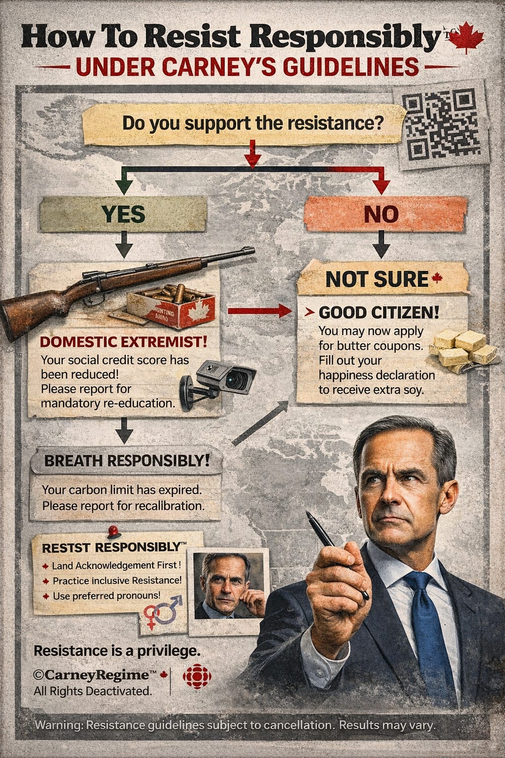 Let’s talk leadership. Our current Prime Minister, Mark Carney, is a triple-passport WEF alumnus who probably thinks muzzle flash is a COVID symptom. High priest of climate finance, graduate of Davos finishing school. The man who speaks fluent Central Banker and whose idea of sovereignty is an IMF white paper with maple leaves on the header.
