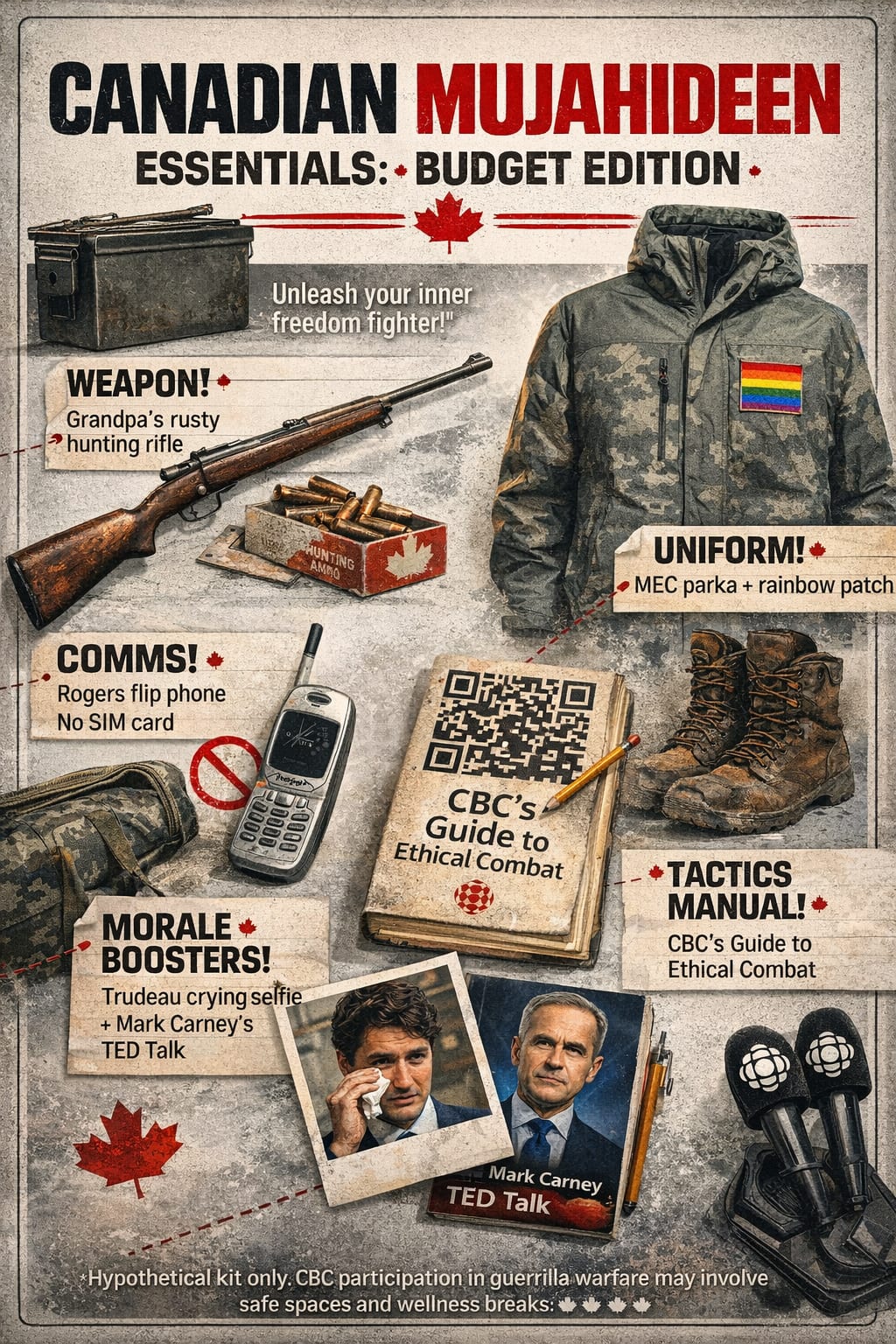 Exactly. We’re talking snowshoe insurgency. Just picture it: Ottawa bureaucrats in fleece jackets, loading heirloom .22s, passing hand signals between Tim Hortons drive-thrus. The maple-flavoured jihad.